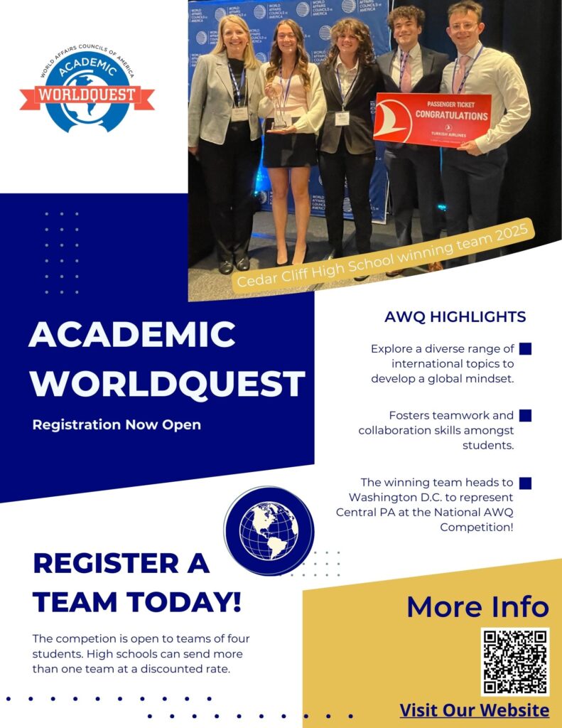 The World Affairs Council of Harrisburg offers a diverse array of program series throughout the year, designed to keep you informed and engaged on topical and compelling subjects. Our programs feature expert speakers, thought-provoking discussions, and interactive sessions that cater to a wide range of interests. Click below to learn more about each series and join us in exploring the world of global affairs.