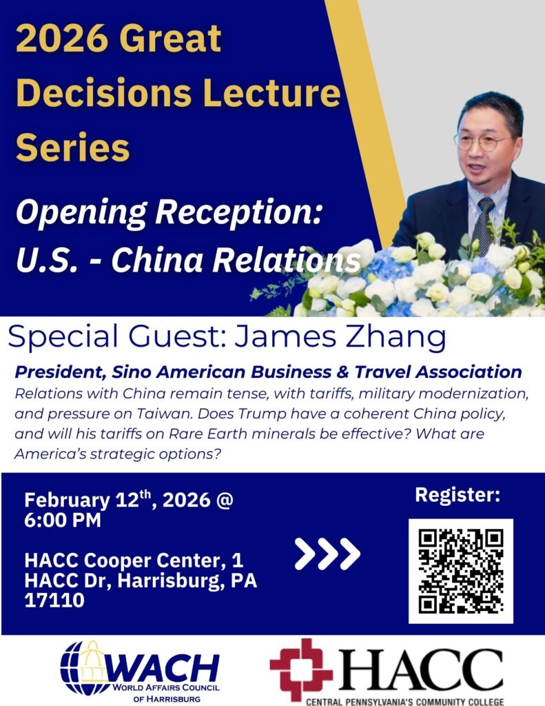 The Great Decisions Lecture Series is America’s largest discussion program on world affairs. The program model involves reading the Great Decisions Briefing Book, watching the documentary film series, and meeting in a discussion group to discuss the most critical global issues facing America today.