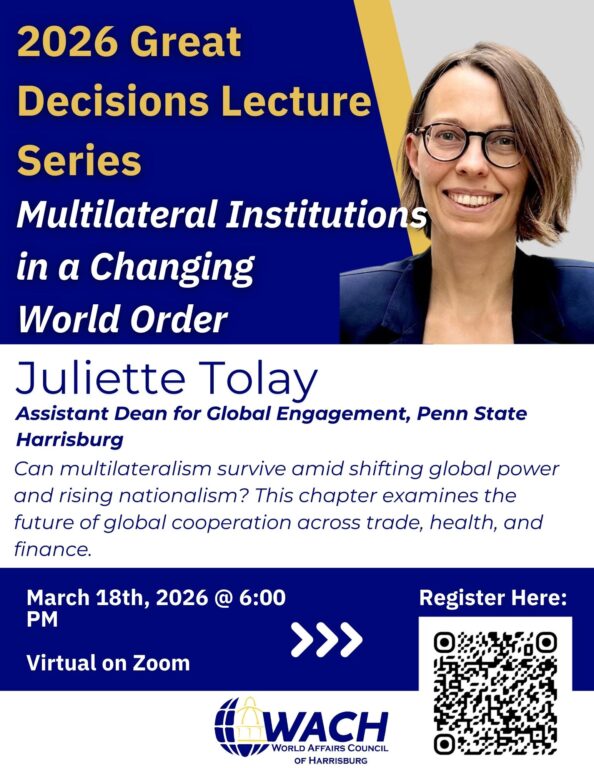 2026 Great Decisions Lecture SeriesU.S. Engagement with Africa The World Affairs Council of Harrisburg invites you to a virtual Great Decisions lecture featuring Dr. Ali Dinar, Senior Lecturer in the Department of Africana Studies at the University of Pennsylvania. Africa’s…